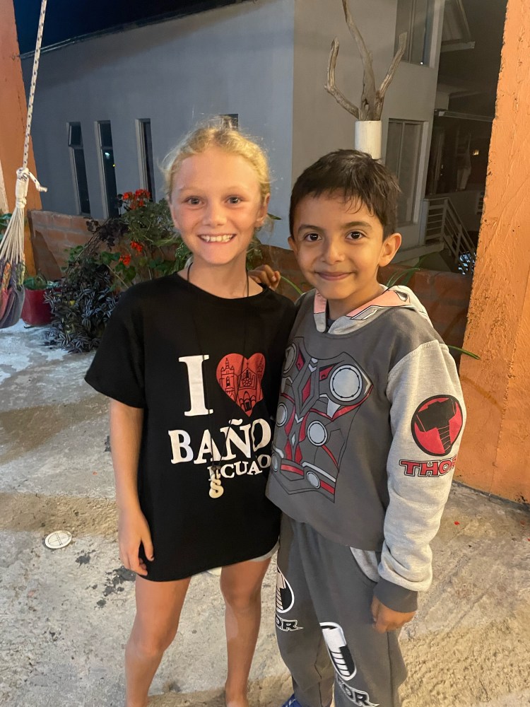 So we had to take a 3 hour bus to Baños (Baños in Spanish means toilet). When we had arrived in Baños we had to say goodbye to everyone. It was very very sad. Then after we said goodbye we checked into a really nice hotel called Hostel La Casa Amarilla City (that means yellow house in English). It had 2 Spanish speaking kids and a really cute dog called Mash (pronounced Max). Mum and I practiced our Spanish with the 2 kids. And we figured out that they have never left Baños in their whole life, and that one of them loves Spiderman, and a few other things. Then after we were all unpacked we went to an Indian restaurant with 3 friends we made at the Secret Garden called Jordon, Ryan and Derek. It was really fun. It was also really good Indian food. I got butter chicken with rice. Eso estuvo delisioso (it was delicious).
